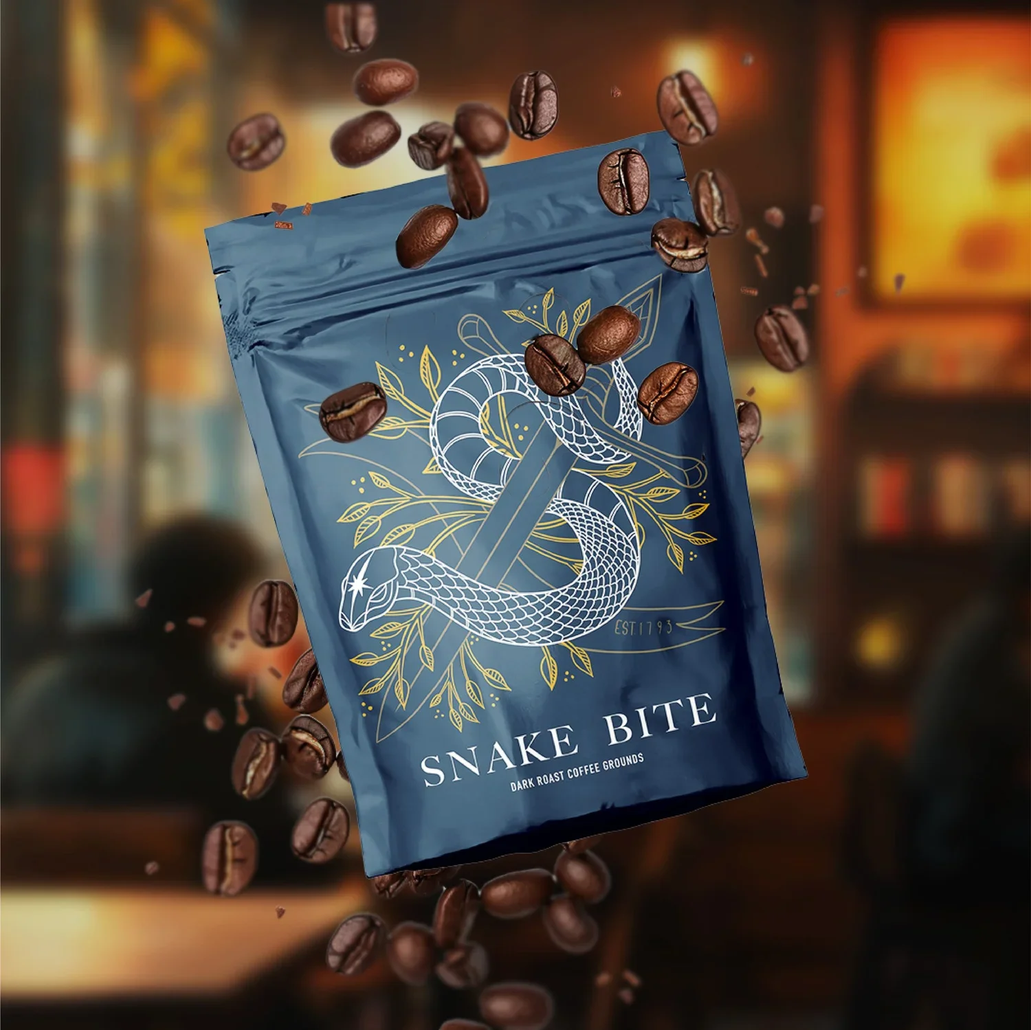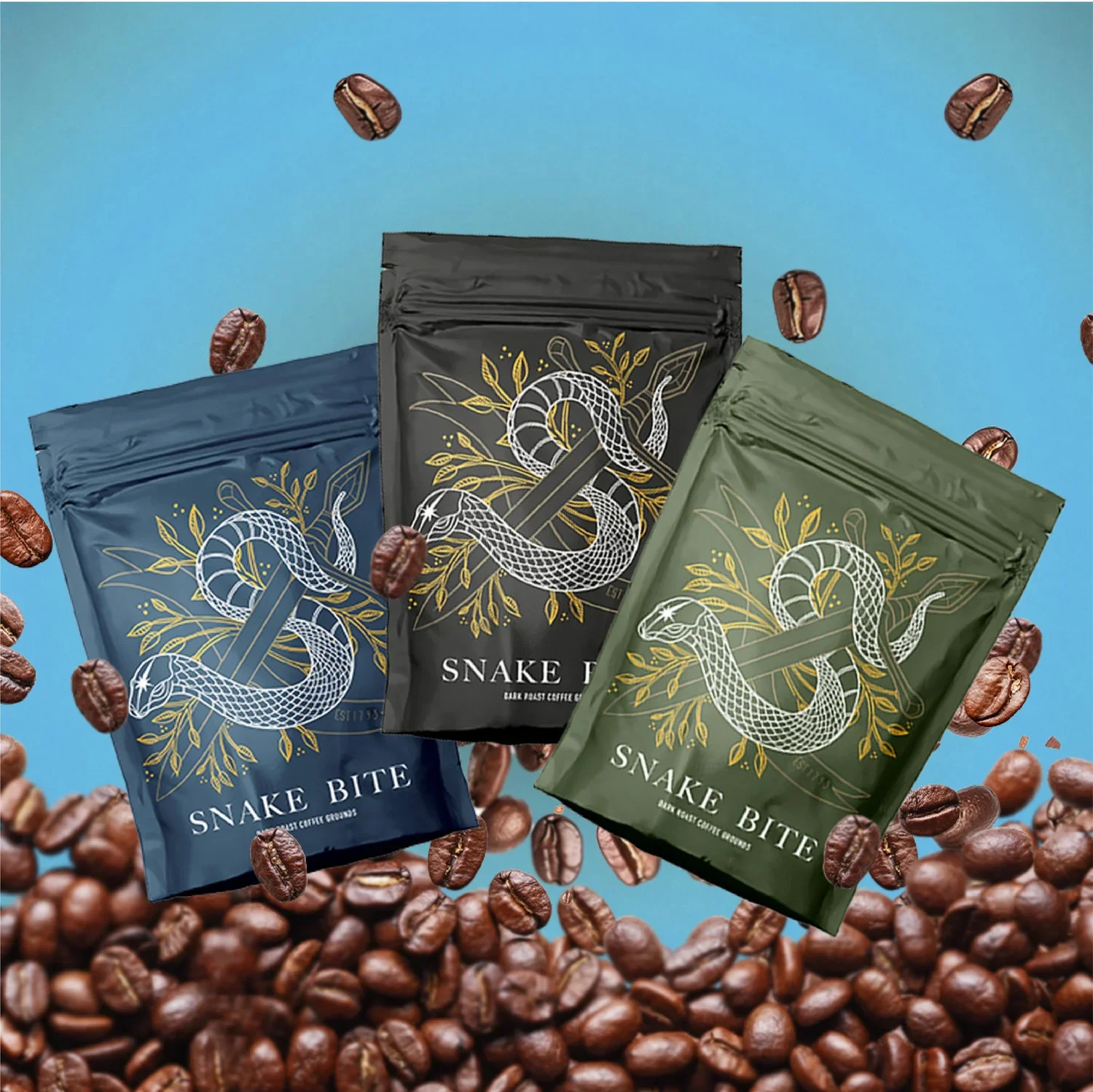 Snake Bite is a personal concept coffee grounds brand that began as a class project focused on redesigning letterforms of the alphabet and evolved into a full packaging system. I expanded the project into a complete brand experience, designing the packaging, visual identity, graphics, 3D renders, and final product imagery, bringing the concept from typography exploration to shelf-ready branding.